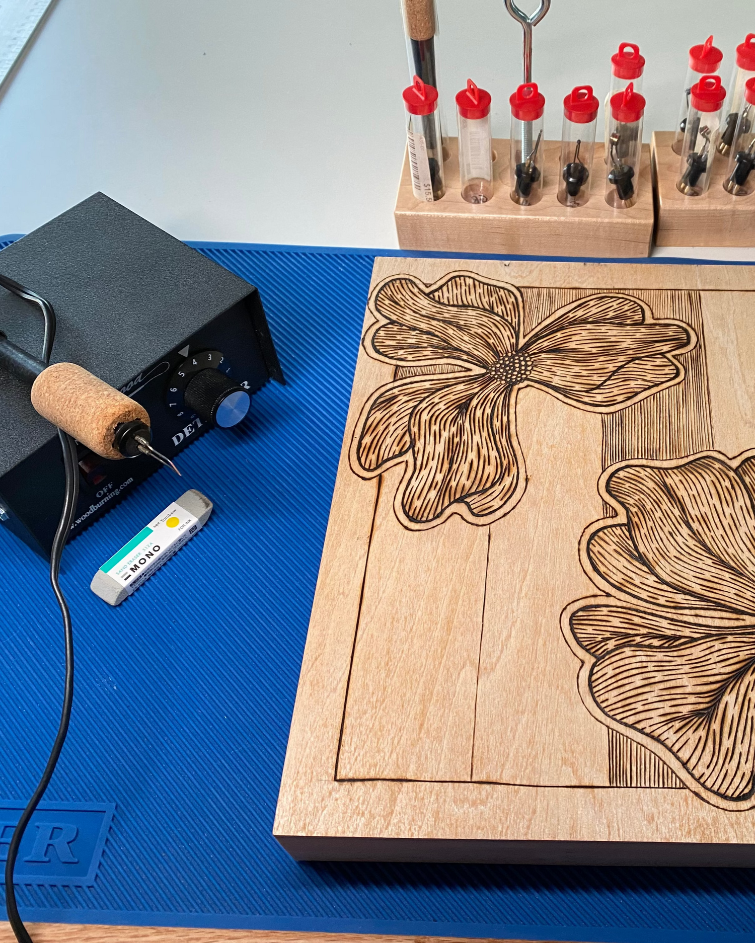 Christy found pyrography and drawing completely by accident - who knew you could start art as an adult?!? She started burning various shapes onto scrap pieces of wood Heath had leftover from projects and pretty soon, she was asking him to make pieces specifically for her to burn.