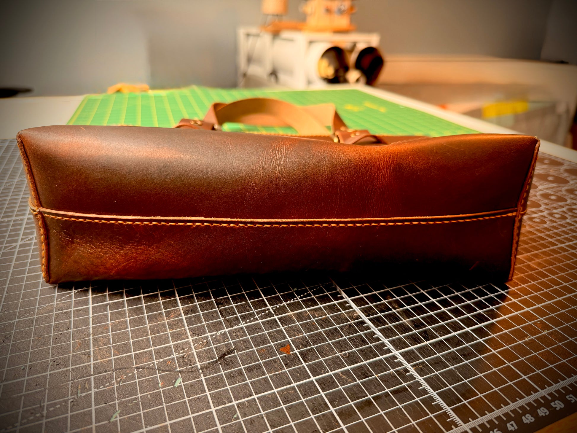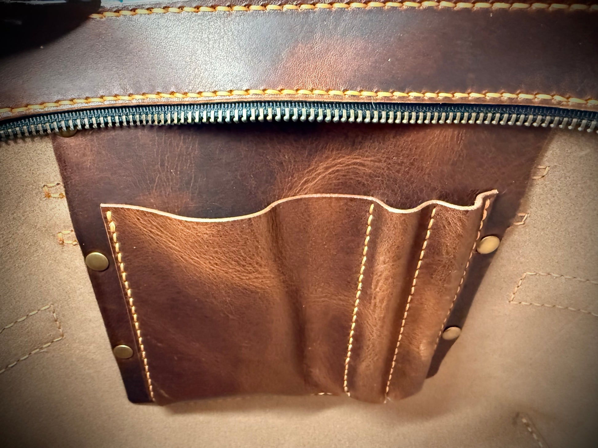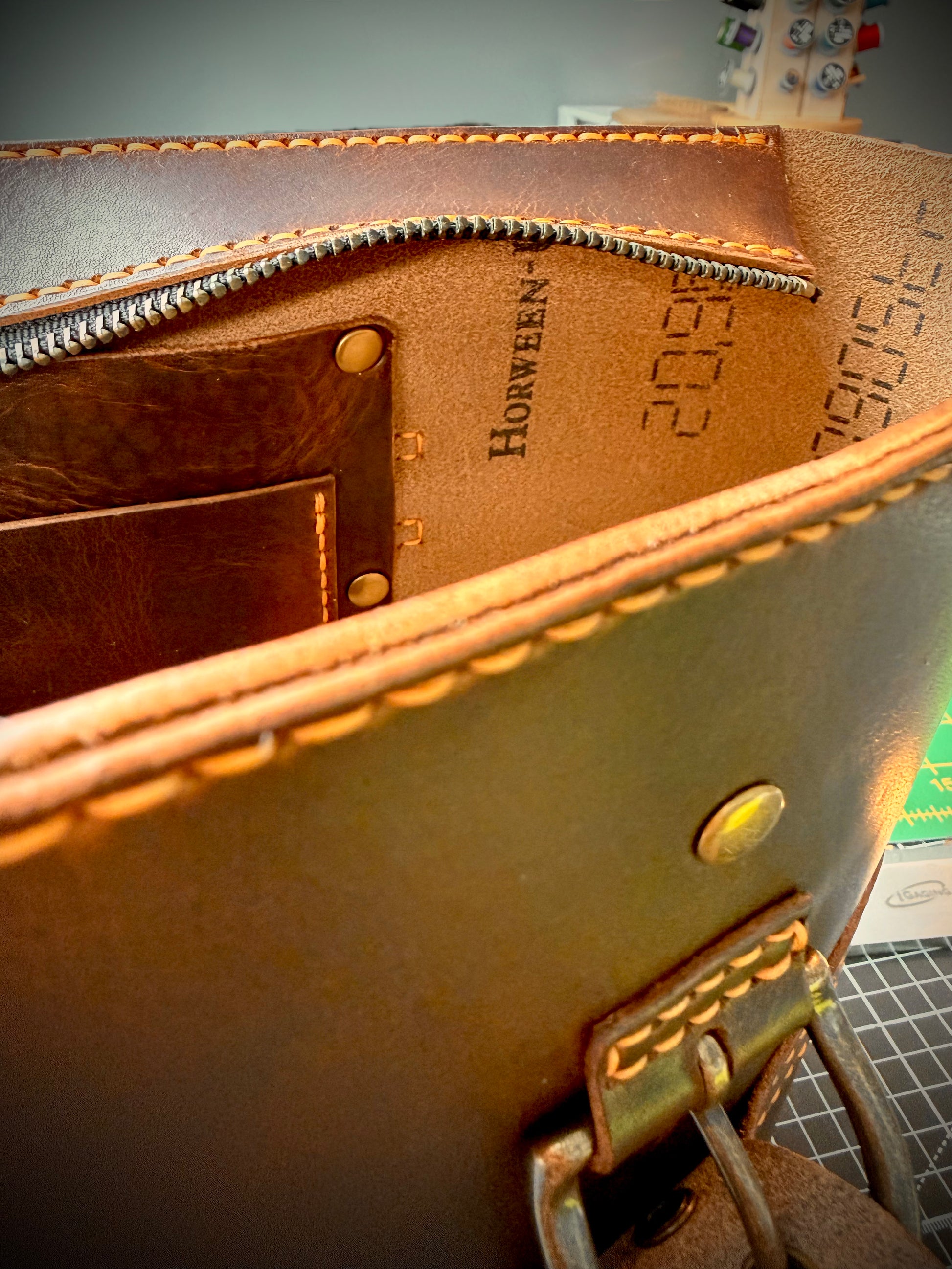 Crafted from Derby leather produced by the renowned Horween Leather Company, this Dark Brown NAMU Tote Bag showcases a vegetable-tanned finish that reveals beautiful golden pull-up tones with every bend and movement, emphasizing its natural character. Designed by The Creative Awl, whose patterns are celebrated for their blend of practicality and aesthetics, the tote features meticulous hand-stitching performed with durable Ritza Tiger waxed thread in Colonial Tan, ensuring strength and refined detail. Solid brass hardware complements the leather’s rich hue, enhancing both durability and elegance.