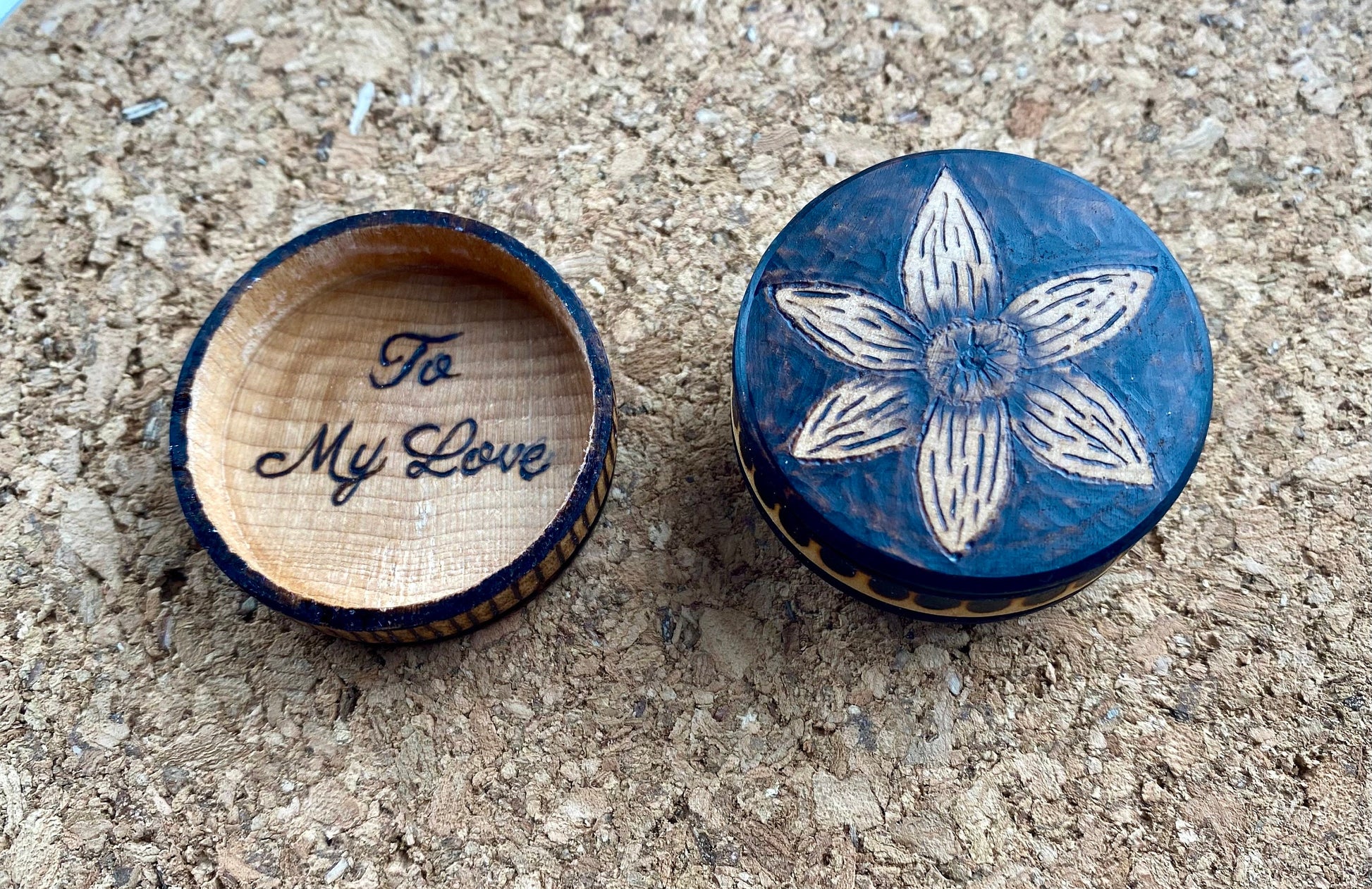 Engagement Ring Box - pyrography (woodburning) floral design - hand drawn
