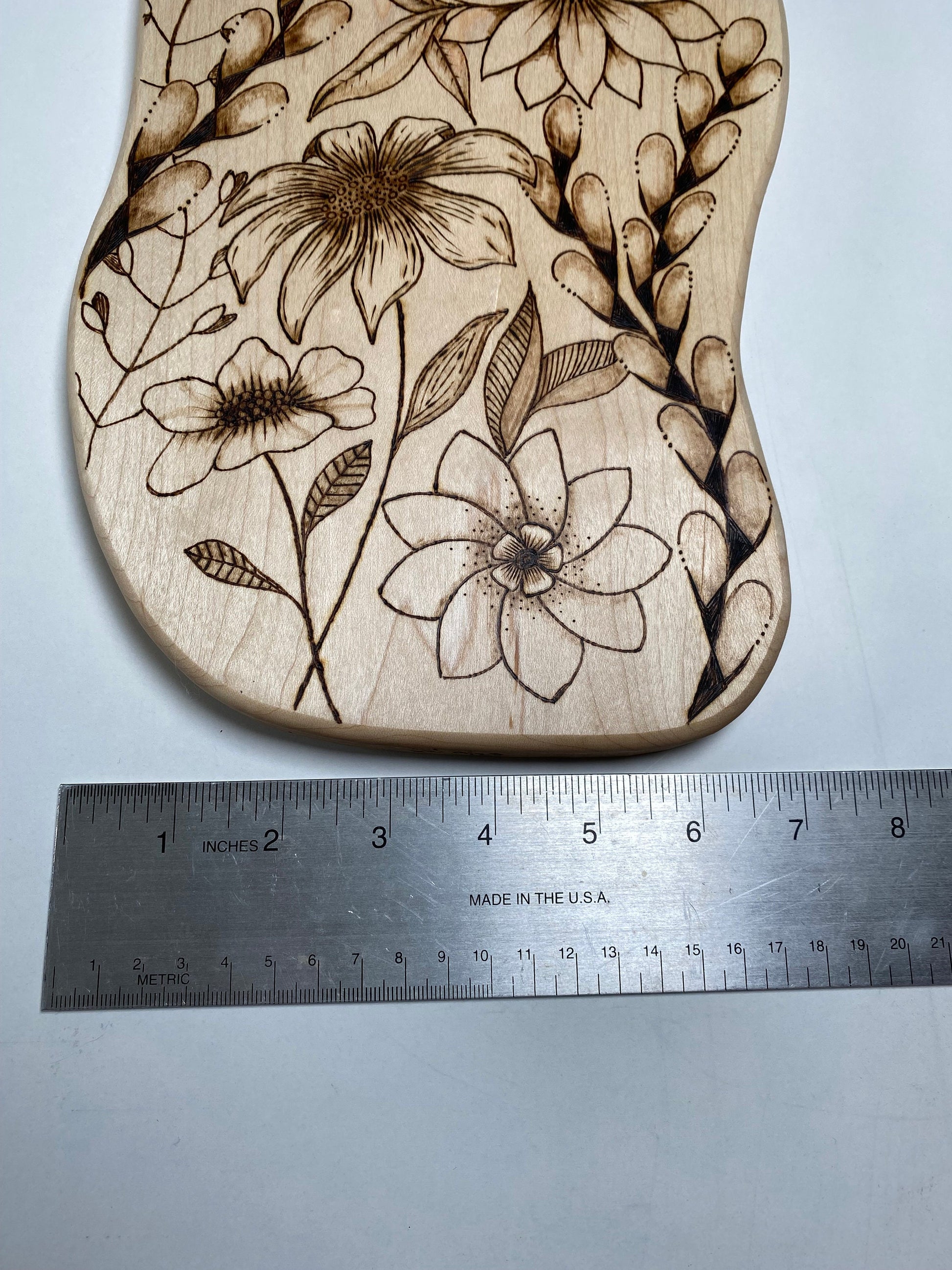 It’s cut is completely organic and fluid, and it features a fully covered, floral-inspired, design on one side, which makes it decorative when you hang it on a wall. Drawing is done completely freehand—no lasers or design programs here. The other side is completely clear, showing the beautiful maple wood grain, making it perfect for letting your culinary delights be the star.