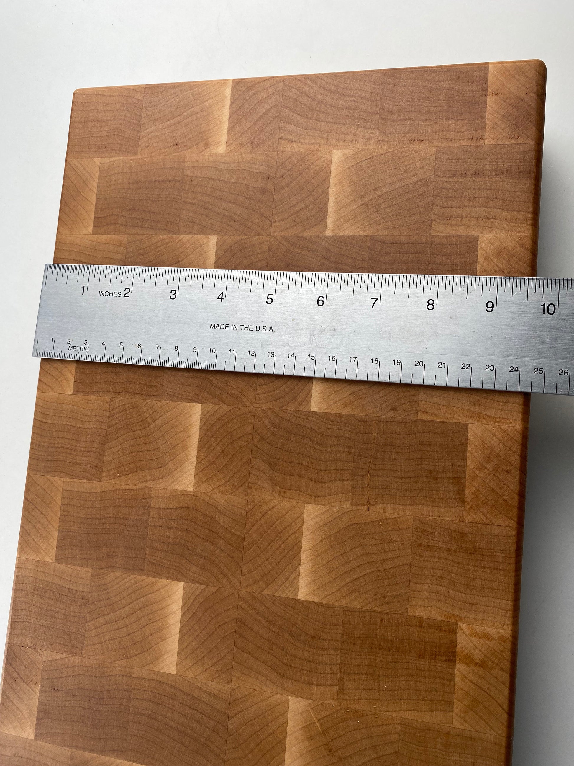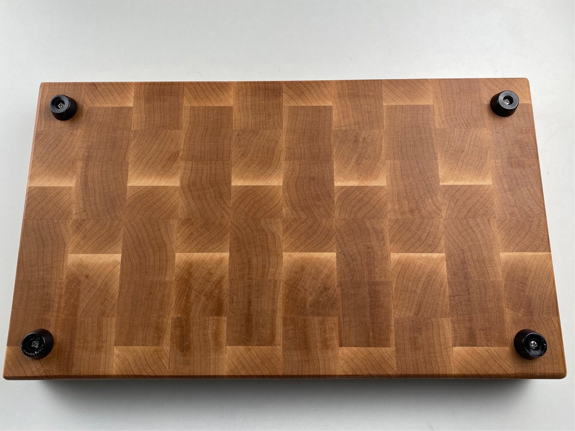 Thick 2 1/4-inch End-Grain Butcher Block style cutting board made from solid Maple. End-grain cutting boards basically "heal" themselves after cutting because the grain is on it's end (facing upward) so you're not cutting through the grain with general use. That's why end-grain cutting boards look like new for so long!