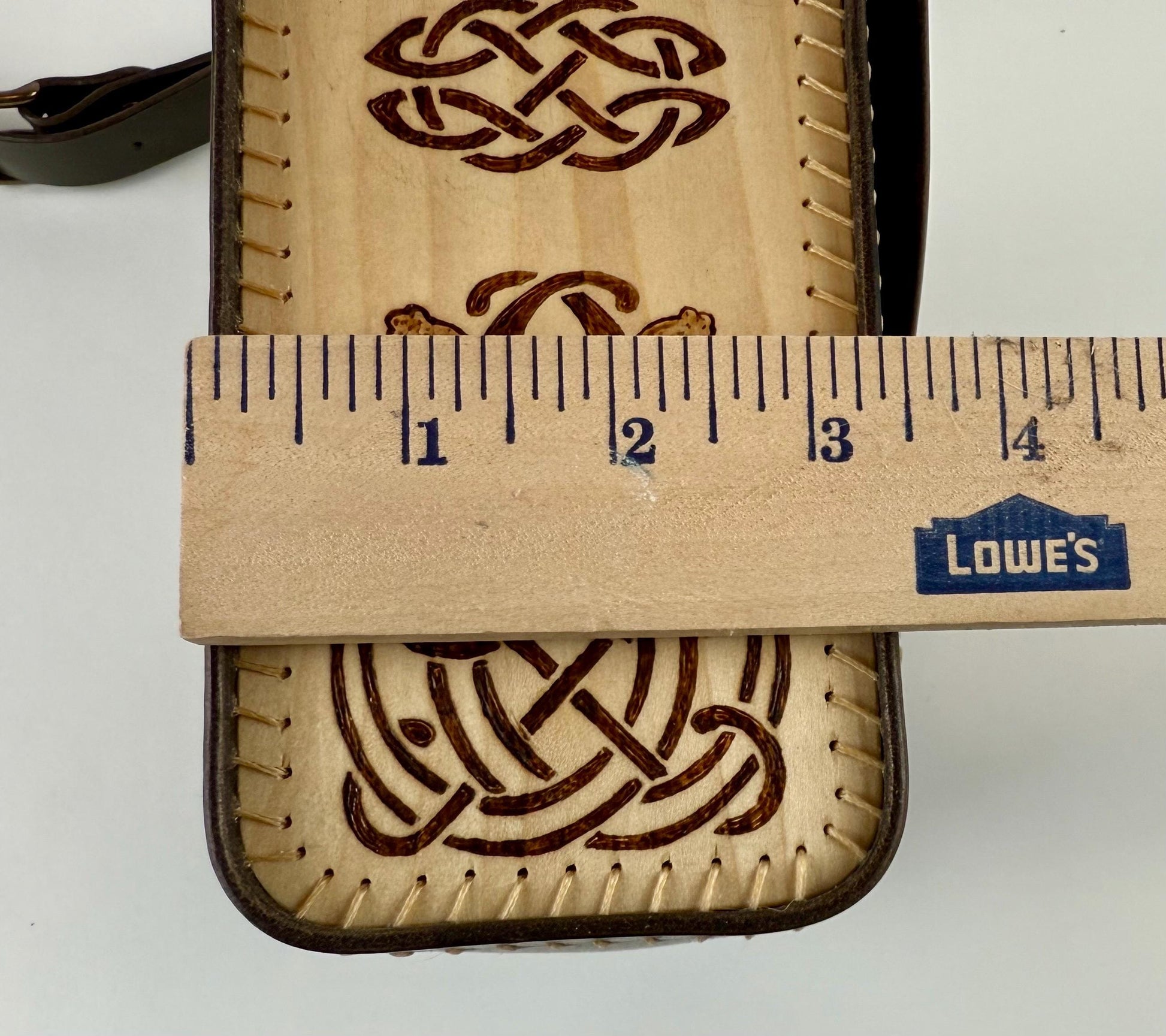 This leather is pretty structured with a stiff temper, making it work really well with the solid maple side panels. Speaking of those side panels, they are roughly 1/8" thick, so they are sturdy without being too heavy. And I've added the Pyro-touch with some Celtic inspired woodburning designs on the surfaces.