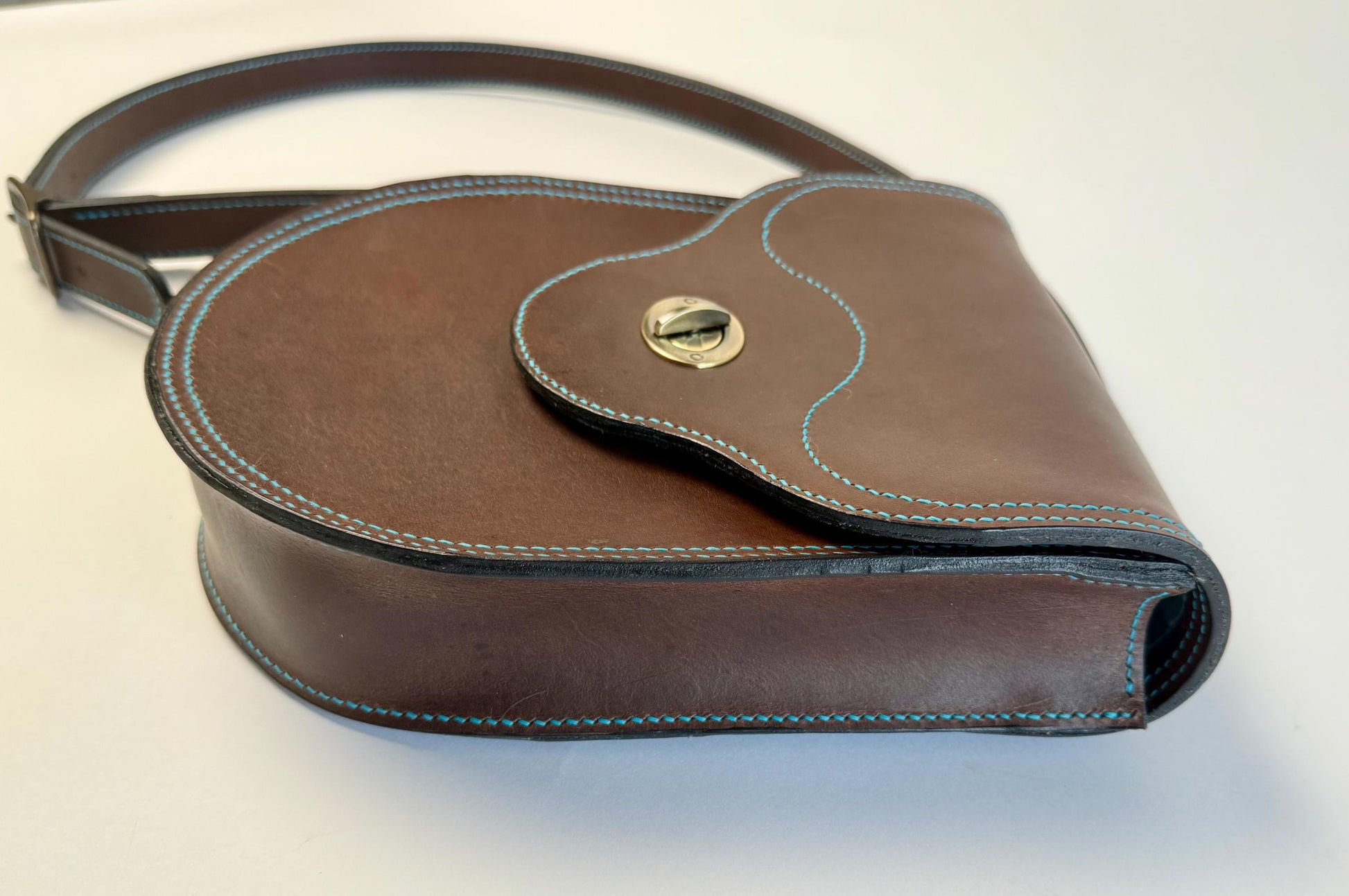 Simplicity is key with this bag, as there are no interior or exterior pockets. The handles are attached with antique brass rivets and has an adjustable brass buckle if you prefer your bag to hang longer or shorter. Closure is a solid antique brass twist clasp. Stitches are using Ritza Tiger waxed thread Aqua/Turquoise color.
