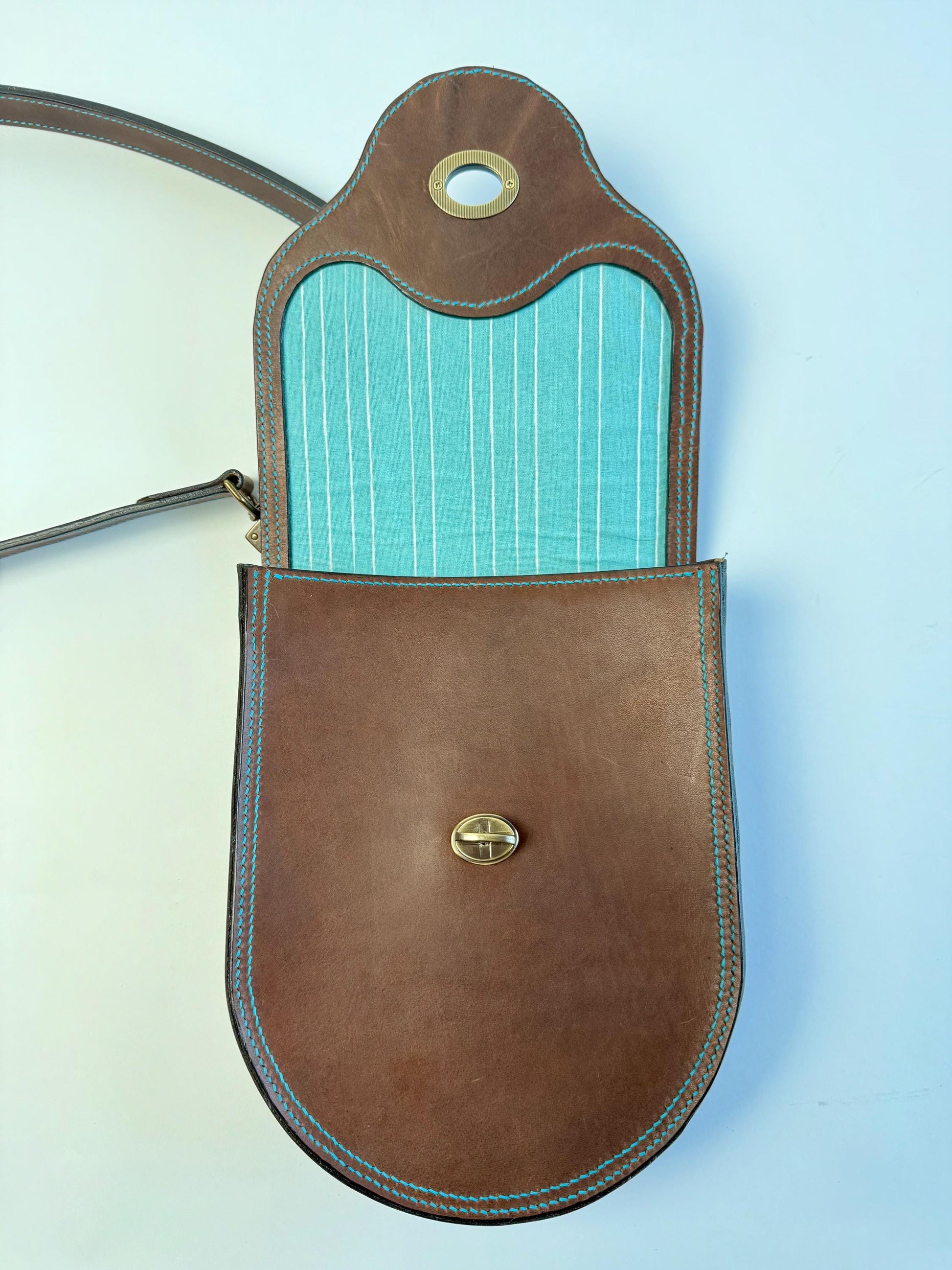 Handmade Leather Horseshoe-style Crossbody Bag - Teal thread - Fully Lined Teal Stripes - Horween leather - Hand-Stitched