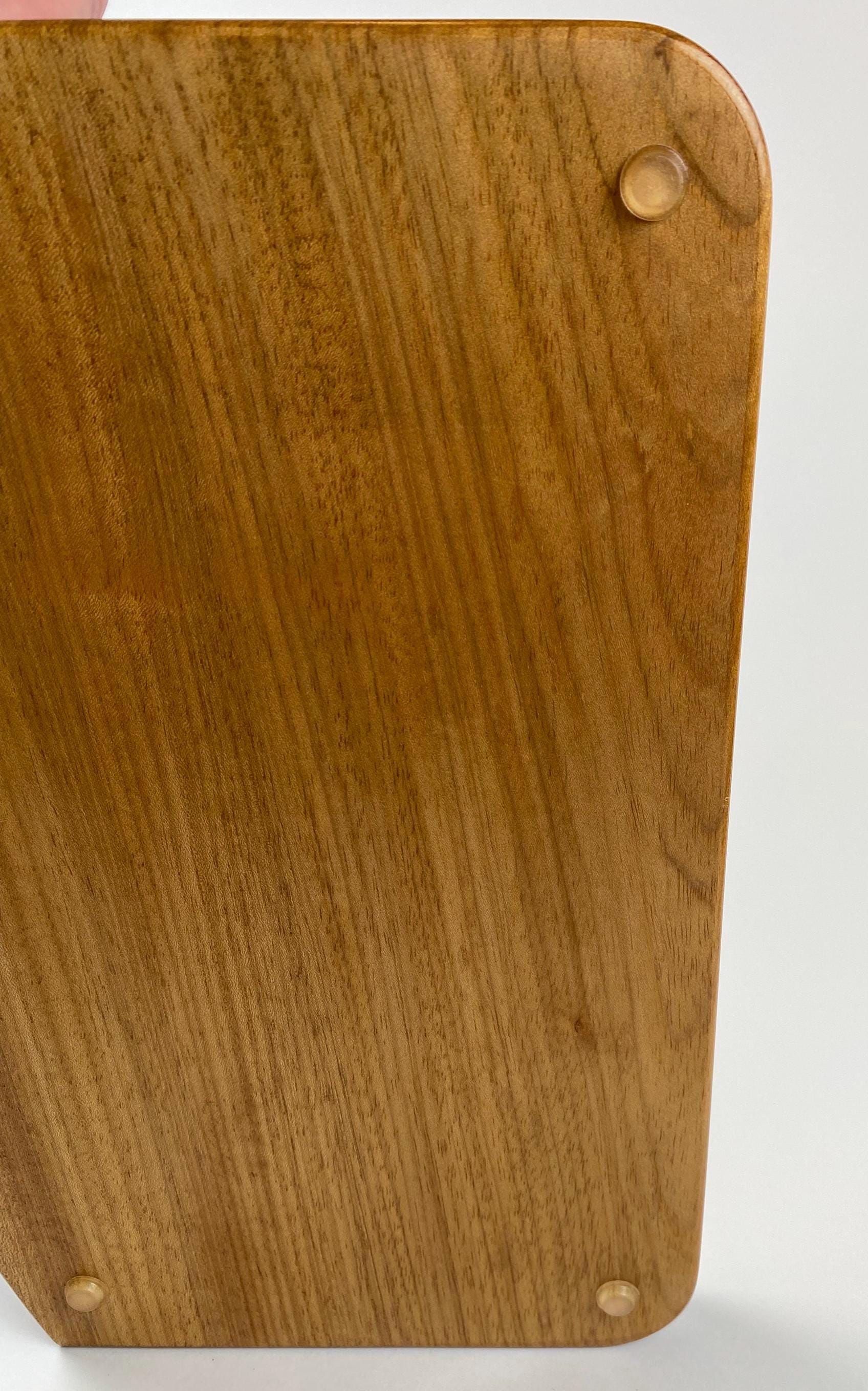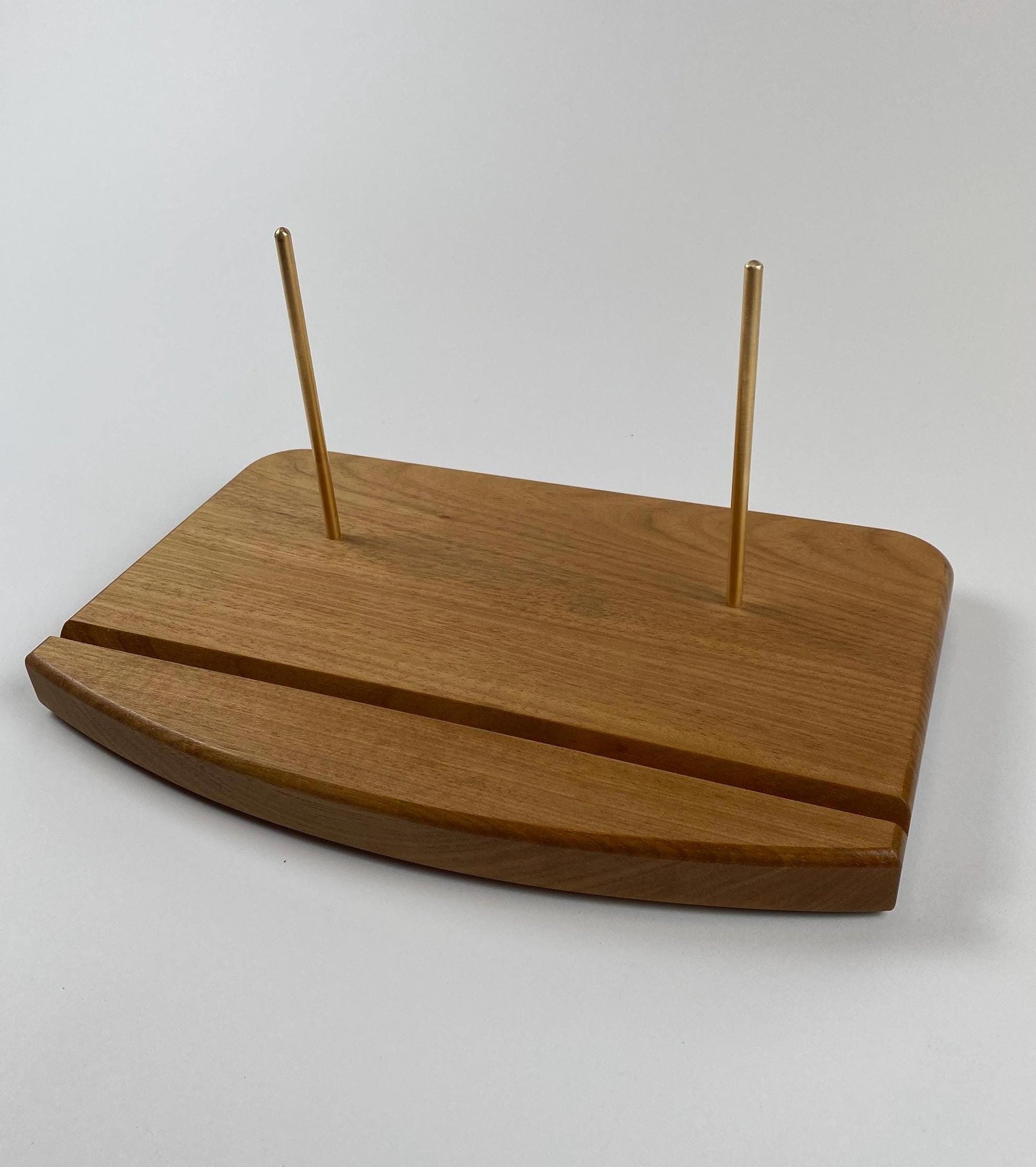 Made of Brazilian Oak, this has a color similar to Cherry or Teak, but with the heft of Oak. The front has a slight curve to soften the overall appearance. The groove for the album is thick enough for a single or double album cover. Everything rests on two solid brass rods to support the album cover at a nice angle. Finally, we also added 4 rubber feet to the bottom so it doesn’t slide around each time you change records.