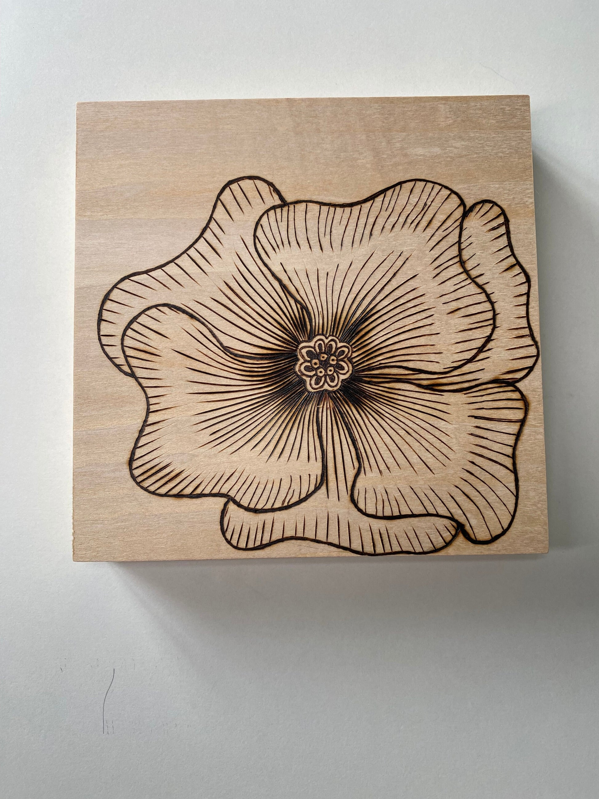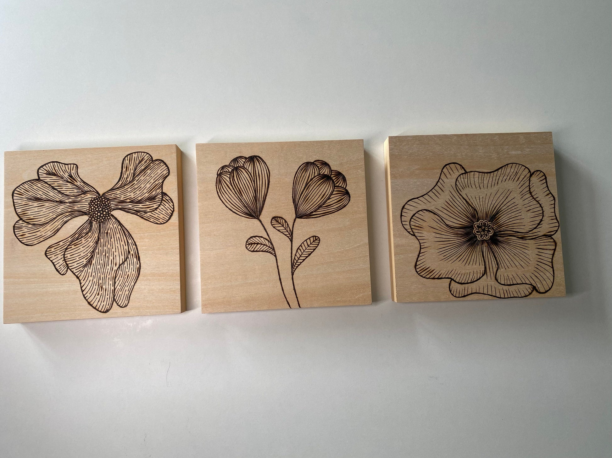 Simple line-drawn flowers inspired by zentangle drawings are woodburned by hand into three 6 x 6 wooden tiles. Hang together or apart, the choice is yours. These also stand on their edge if you prefer not to hang and just want to display them.