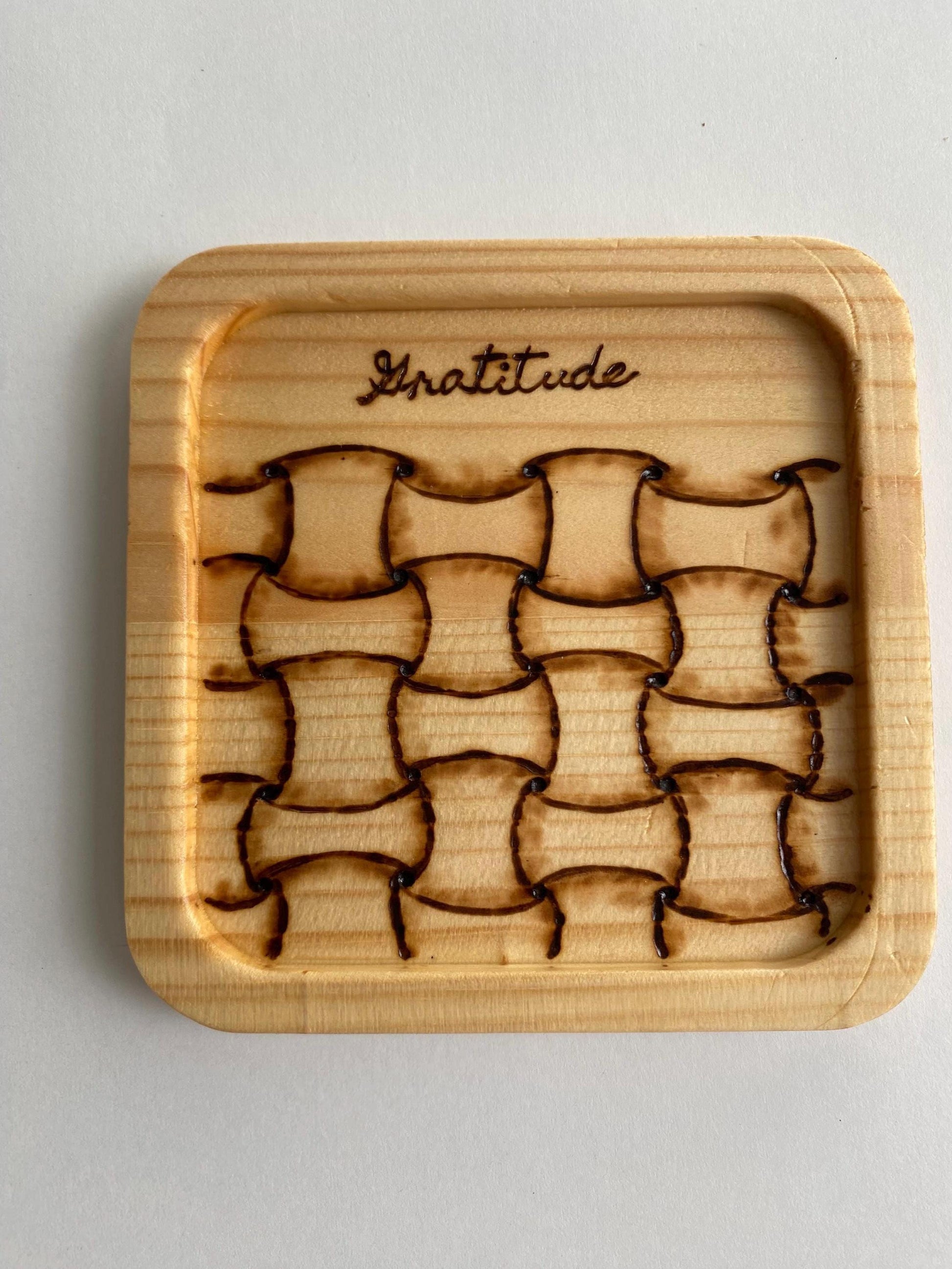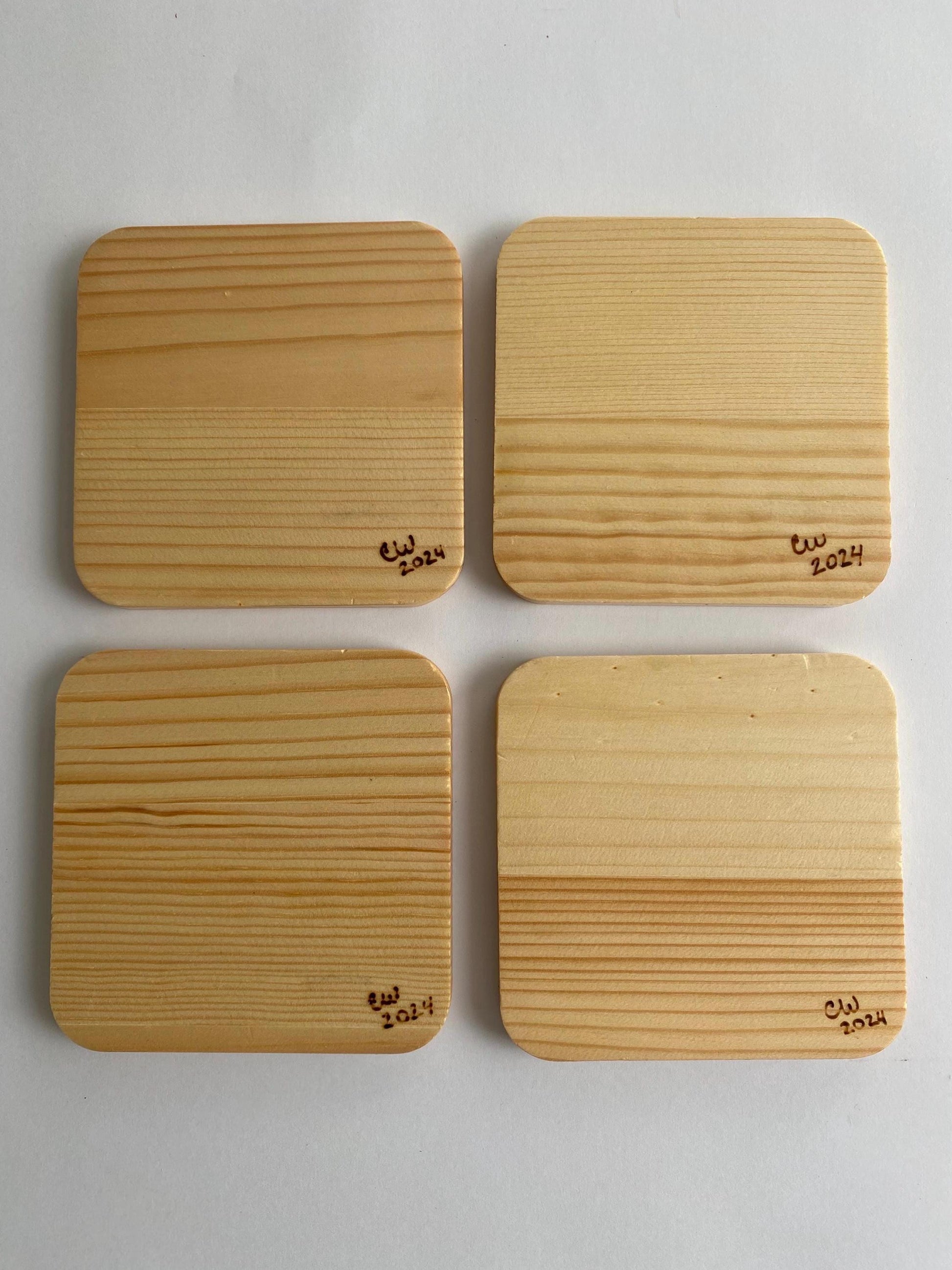 Set of 4 lightweight pine coasters. Each coaster measures 4" square and is recessed about 1/8” in the center.